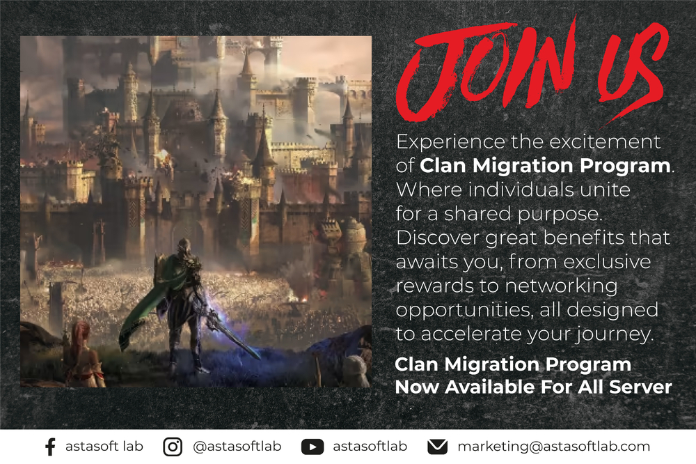 This program are for any Community (clans/guilds etc) that are active, looking to move and want to join Astasoftlab's Lineage II Essence SEA, it will support to give best growth for your community! General Requirement : - Possesing an active social media (Facebook,Instagram etc) - Post an invitation to play on your social media account to your community (clans/guilds etc) - Use #RewriteHistory & #Astasoftlab also mention to Astasoftlab's social media (Facebook,Instagram etc) - Forming a clan with a minimum 5 members (clan leader included) - Compliance with the rules of the game and the rules of the service (Facebook/Instagram) - Respectful attitude to others in the game, on Astasoftlab's platform and channels partner - Be Professional without using any 3rd Party Program (ie. bots, etc) - Astasoftlab entitled to over every work implementation activities and to advise or instruction to ensure purpose employment or campaign More info visit : Clan Migration Program